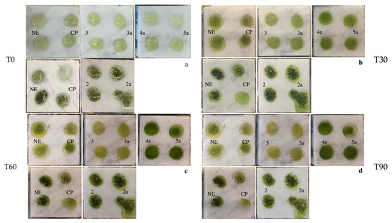 Untreated (CP) and treated marble probes’ behavior toward the microbial colonization under laboratory conditions. (a) Immediately after inoculation, T0; (b) after 30 days of incubation under constant illumination, T30; (c) after 60 days of incubation under constant illumination, T60; and (d) at the end of the experiment (90 days of incubation under constant illumination), T90.