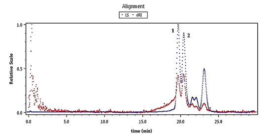 The precision of the method related to the instrumentation and to sample preparation. Figure 3 shows the overlaid differential molar mass obtained using Zimm detector fit method [26]. The vertical coordinate was the linear differential molar mass. The peak area represents the content of a range of molar mass. According to Figure 3, the molar mass of HBP-OH centered on 0~400 g/mol.