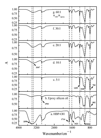 FT-IR spectrum of raw materials and NHSi with different reaction ratio of n-OH:n-epoxy. (a) HBP-OH, (b) Epoxy silicon oil, (c) 5:1, (d) 10:1, (e) 20:1, (f) 30:1, (g) 60:1.