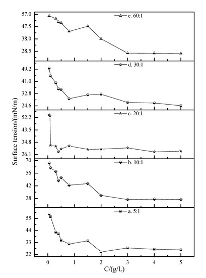 The surface tension curves [18] of NHSi prepared by different molar ratio (n-OH: n-epoxy) were shown in Figure 6. It can be seen from Figure 6 that the surface tension of NHSi solution decreased with the increase of solution concentration, but the decreasing trend becomes slower after reaching a certain concentration. When the ratio of n-OH:n-epoxy was 30:1, the lowest surface tension 24.71 mN·m−1 was obtained when the mass concentration was 5 g/L. When NHSi was dissolved in water, the hydrophilia segment (hydroxyl groups) was switched to the inner part of aqueous solution, while the organosilicone linear segment was spread on the surface of water. The hyperbranched structure decreases the distance between the adjacent surfactants polymer [31], and the attraction force between surfactant is lower than the hydrone molecule. The surface tension of NHSi solution decreased.