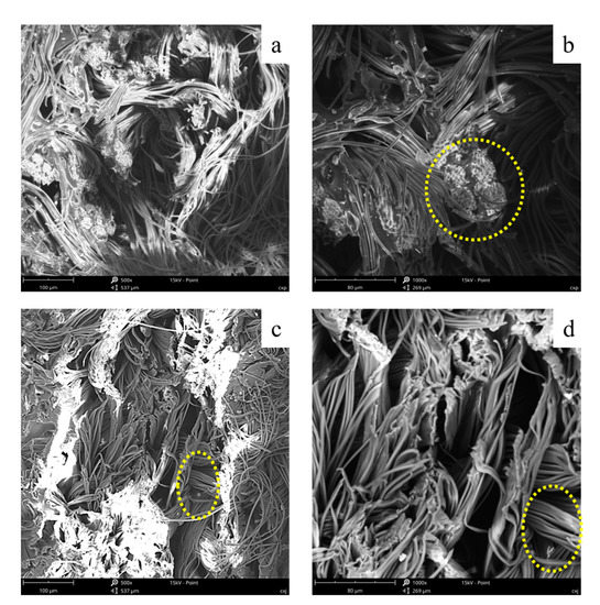 The structures of superfine fiber synthetic material (a), the surface of fixed sea-island superfine fiber, ×500; (b), the surface of fixed sea-island superfine fiber, ×1000; (c), the cross section of fixed sea-island superfine fiber, ×500; (d) the cross section of fixed sea-island superfine fiber, ×1000.