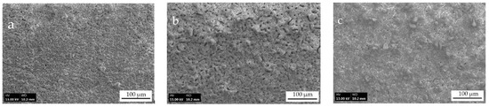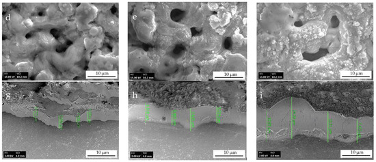 Figure 1 shows typical SEM microphotographs of the surface morphology of PEO-treated specimens. The presence of many small holes/cracks/pores with an average pore size ranging from 0.5 to 4 μm corresponded to plasma discharge channels, as depicted in Figure 1d–f. Shrinkage cracks of larger pancake-shaped particles are not visible from the surfaces. Thereby a uniformly distributed porous structure with a relatively smooth surrounding area near the pores poses a characteristic of the dense oxide layers grown by PEO processes utilizing the unipolar DC electrical mode [17]. The intensity of the surface pores depends on the PEO treatment parameters, coating roughness and the pores size diameters increasing with a greater current density of applied potential, similar to Chiesa’s findings [25]. Figure 1 shows that the pore shape was mostly round and most pores were found to be not connected.