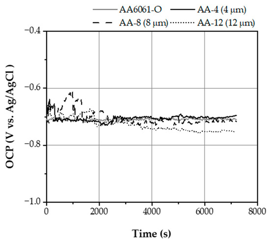 Another observation made from the OCP analysis is a data noise caused by potential oscillation behavior. The oscillation amplitude, after 90 min of exposure to the test solution, was found to be approximately 9 mV for the bare 6061-O alloy; that of AA-4 about 10 and 28 mV were obtained for the AA-8 coating, while AA-12 showed 11 mV in potential oscillation. It is considered that the magnitude of the oscillation depends on the surface roughness that results in the changing of an oxide layer through the progression of PEO treatment time. This feature is attributed to and associated with activation—repassivation process during the formation of new interfaces at the surface/coating boundary, similar to previously reported findings [27]. Another possible reason for such behavior is that the surface roughness promotes effective nucleation and propagation of metastable and stable diffusion paths inside the coating since ionic conduction predominantly occurs through the loose coating layer. A more detailed investigation of this effect should be made in future work, whereas adsorption effects of electrolyte’ ions at the coating surface must be considered in detail.