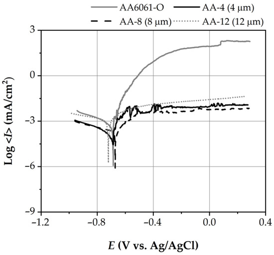 Typical cross-sectional images of the formed coatings subject to evaluation in this study are depicted in Figure 1g–i. It can be seen that the coating thickness is about 4 microns for AA-4 and 8 µm of AA-8, whereas this reaches 12 µm for AA-12 with a highly dense structure. The evolution of micro-cracks and micropores distributed through the coating layer is clearly observed suggesting that the PEO treatment time plays a critical role in the formation of dense oxide layers. Also, as can be observed, the micropores formed at the substrate interface caused by gas bubbles at the micro-discharge channels Figure 1i, suggesting a presence of the voltage threshold. The dense oxide layer integrated firmly into the aluminum substrate should be considered as the main feature enhancing the corrosion resistance properties of PEO-treated 6061-O aluminum alloy. This fact was reported previously in the other studies, whereas the interface between the oxide layer and the aluminum substrate does not have any discontinuity [26]. This is a reference to a viewpoint discussed and supported by the electrochemical tests described below.