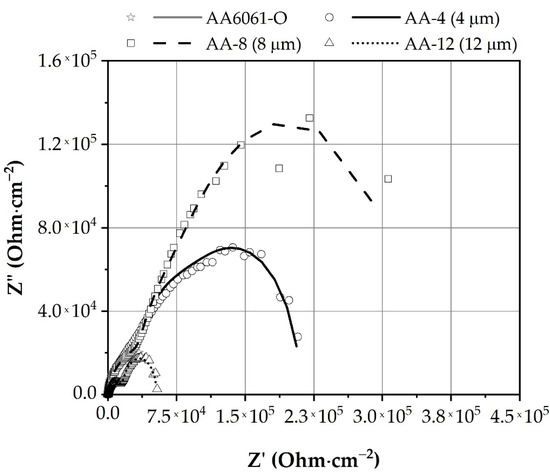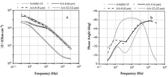 Electrochemical impedance spectroscopy (EIS) analysis was carried out in addition to linear DC polarization studies to attain a more detailed examination of the corrosion susceptibility and protection properties of PEO-formed coatings. The characteristic EIS spectra of the specimens investigated in the present study are presented in Figure 4 and Figure 5. The bare 6061-O alloy exhibited much lower impedance magnitude in the high-frequency domain (>102 Hz) compared with the PEO-treated 6061-O alloy, regardless of the coating thicknesses when considering the fact that the high-frequency impedance usually reflects the resistance of the coating [31]. Similar behavior was found in the low-frequency region (0.1–1 Hz), where the AA-8 specimen presented a higher impedance modulus in comparison to other investigated specimens and the phase shift at high frequency is due to the capacitive properties of the PEO-formed coatings (Figure 4b). On the other hand, as observed, the impedance at the low-frequency region represents the corrosion resistance of the coatings (Figure 4a). By comparing the EIS spectra of each tested specimen, it could be concluded that the PEO treatment has a significant effect in improving susceptibility to corrosion of aluminum alloys. As previously confirmed, the protection ability of the AA-8 coating deteriorated in line with an increase of PEO treatment time. However, it is best in comparison to AA-4 and AA-12.