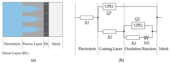 Schematic illustration (a) and equivalent circuit (b) representation with mixed kinetic and charge-transfer control used to model the electrochemical impedance spectroscopy (EIS) spectra of PEO-coated specimens.