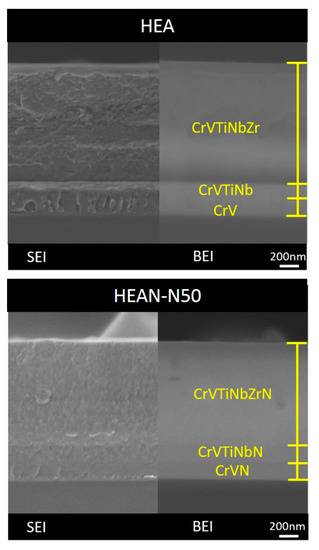 Figure 1 showed cross-sectional SEI and BEI images of the CrVTiNbZr(N) coatings with different nitrogen flow rates. Assisted by the SEI and BEI, the HEA coating contained CrVTiNbZr top layer (~1.15 µm) with CrV as bottom layer (~0.2 µm) and CrVTiNb as interlayer (~0.15 µm). When nitrogen was introduced to form nitride coatings (HEAN-N50 and HEAN-N165), continuous columnar growth was observed. It can be observed a compact columnar microstructure for the synthesized coatings. Similar results can be found in previous studies of VAlTiCrMo high-entropy alloy nitride coatings [29] and AlCrTiZrHf high-entropy alloy nitride coatings [26]. The thicknesses of the deposited HEA and HEA nitride coatings were ~1.5 μm. The chemical composition of the top layer of the deposited coatings was measured by EDS. Table 1 shows the chemical contents of the CrVTiNbZr(N) coatings with different nitrogen flow rates. According to the measuring error of our EDS, the SD was ~10% of the measured value. When no nitrogen is introduced, the contents of five metal elements in the CrVTiNbZr HEA coating are between 14.13–26.8 at.%. It can be found that the HEA coating conforms to the high entropy alloy definition the atomic percentage of each element within the range of 5% and 35%. With increasing the nitrogen flow rate, the nitrogen content in the HEA nitride coatings increased rapidly at first and then stabilized due to the high ionization of cathodic arc evaporation [30,31]. A recent study by S. Avtaeva et al. [31] had shown that the most probable mechanism of nitrogen dissociation in the low-pressure arc conditions was the excitation transfer between Ar and nitrogen. When nitrogen flow rate of 50 sccm was introduced, the nitrogen content of HEAN-N50 increased to 41.27 at.%. The nitrogen content of the HEA nitride coatings greatly increased with increasing nitrogen flow rate. When the nitrogen content continued to increase, the N atom dissolved into the lattice of the HEA nitride coating. With increasing nitrogen flow rate to 165 sccm, the nitrogen content in the coating increased above 50 at.% and tended to be stable. An increase of the nitrogen flow rate in the deposition environment led to decrease in the average energy of deposited metal and nitrogen particles because of collision losses, and increase in the saturation of HEA nitride coatings with nitrogen content. The HEA nitride coatings were regarded as saturated nitride coatings. Some of the nitrogen atoms were expected to be interstitially incorporated in the coatings [23,32].