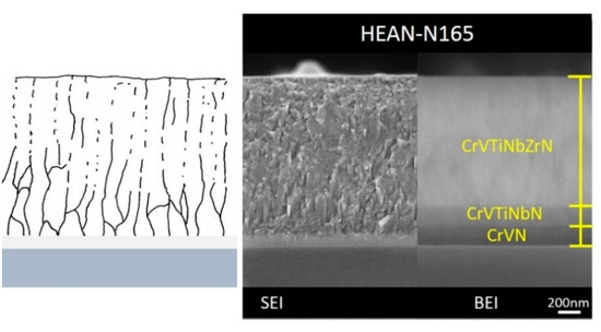 Cross-sectional SEM micrographs including SEI and BEI images of the CrVTiNbZr(N) coatings with different nitrogen flow rates (HEA, HEAN-N50 and HEAN-N165). A schematic illustration shows the compact columnar microstructure of the HEAN-N165 coating.