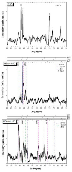 Glancing angle X-ray diffraction pattern of the deposited CrVTiNbZr(N) coatings with different nitrogen flow rates (HEA, HEAN-N50 and HEAN-N165).