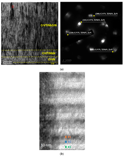 Figure 3a,b shows the cross-sectional TEM images of the CrVTiNbZrN coating (HEAN-N165) deposited with 165 sccm nitrogen flow rate. It can be seen that the columnar structure grows from the specific CrV alloy and CrVN bottom layers to the top CrVTiNbZrN layer without interruption. The high magnification image of the top layer exhibited slightly blurred columnar and multilayered structures containing CrVN, TiNbN and ZrN. The results of EDS measurement showed that the dark layer (#1) was ZrN contributed by Zr target, the gray layer (#2) was TiNbN contributed by TiNb target, and the bright layer (#3) was CrVN contributed by CrV target, as shown in Table 2. The multilayer structure was obtained by periodic rotation of the samples facing Zr, TiNb and CrV targets sequentially. The periodic thickness of the multilayered CrVTiNbZrN was about 15 nm. Coatings with such multilayer architecture, which is capable of dispersing energy and deflecting cracks at layer interfaces, may enhance mechanical properties such as hardness and toughness, and therefore improve tribological properties [27]. Similar results by A. Kameneva et al. [41] showed that the two- and three-component multilayer nitride coatings containing TiN and ZrN had exceptional corrosion resistance in both 5% NaOH and 3% NaCl solutions and superior tribological properties.