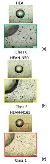 The Rockwell indentation test was used to evaluate adhesion strength of the HEA and HEA nitride coatings. This destructive test exhibited the interfacial adhesion strength between the substrate and the coatings. Figure 4 shows the optical images of the indented contours of the CrVTiNbZr(N) coated specimens with different nitrogen flow rates. According to ISO 26443 [42], the adhesion strength of HEA is identified as class 0, HEAN-N50 is class 2 and HEAN-N165 is class 1. In the case of class 2, small coating delamination was observed, and the adhesion is not so good. The radial cracks without delamination indicated strong and good adhesive strength between coating and substrate, and the adhesion strength in this case was evaluated to class 1, as shown for HEAN-N165. Therefore it can be seen from the results that the coating becomes hard and brittle by adding nitrogen, and brittle failure will occur under concentrated load, while the coating without nitrogen is relatively ductile (the adhesion strength of HEA is class 0). The coating with composition-gradient interlayers can improve the adhesion strength compared to the single-layer coating [27,43]. The result indicates that composition-gradient interlayers and multilayer structure in the hard HEA nitride coatings are beneficial for increasing adhesion strength.