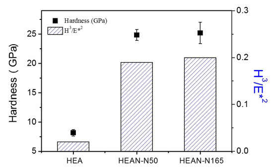 Hardness (H) and the H3/E*2 values of the CrVTiNbZr(N) coatings with different nitrogen flow rates (HEA, HEAN-N50 and HEAN-N165) measured by nano-indentation.