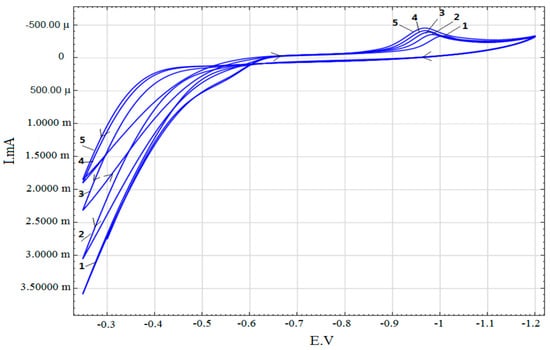 In Figure 1, the cathode maximum (A) is observed on the cyclic volt-ampere curves at a potential of −1.0 V.