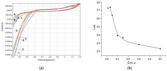 Volt–ampere curves of an iron electrode (a) and a change in the ionization current of the iron electrode (b) at different concentrations of Mo (VI). Electrolyte 0.3 M Na2SO4 + 0.2 g/L Zr (IV) + Mo (VI) (g/L): 1—0.1; 2—0.3; 3—0.5; 4—1; 5—1.5.