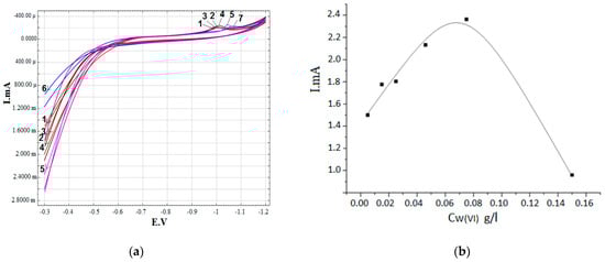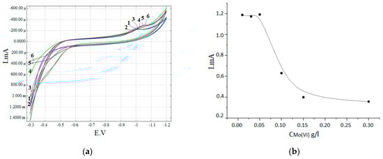 The concentration of molybdenum in a solution was changed from 0.01 to 0.3 g/L. According to Figure 4a, the addition of Mo (VI) ions led to the appearance of a small cathode wave at E = −1.08 V and the displacement of iron electrode ionization potential to the anode region, indicating greater difficulty in the ionization process. According to Figure 4b, an increase in the concentration of molybdenum (VI) from 0.01 to 0.15 g/L in solution promoted a sharp reduction of the ionization current from 1.2 to 0.35 mA. A further increase in the tungsten (VI) concentration did not lead to a noticeable change in the ionization current of the iron electrode. Thus, the optimal electrolyte, in which the minimum ionization current of the iron electrode was observed, was the composition: 0.2 g/L Zr (IV) + 0.15 g/L W (VI) + 0.15 g/L Mo (VI) shown in Table 2.