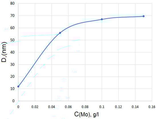 The thickness of oxide-zirconium coatings deposited from a solution of 0.2 g/L Zr (IV) + 0.15 g/L (VI) with different concentrations of Mo (VI) was investigated (Figure 6).
