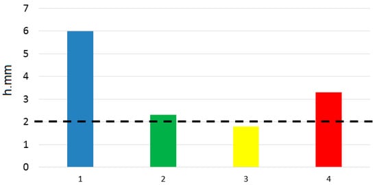 Dependence of the width of the separation of the paintwork from the cuts on concentrations of Mo (VI) g/L: (1) 0; (2) 0.05; (3) 0.1; (4) 0.15 in deposition solution 0.2 g/L Zr (IV) + 0.15 g/L W (VI).