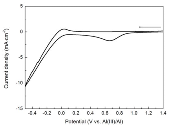 Magnesium alloy is one of the lightest metal materials in industrial applications at present. It has the advantages of low density, high specific intensity, good machinability, low casting cost, and abundant resources [1]. Therefore, it is widely used in aerospace, automobile manufacturing, high-speed rail, and other fields [2,3,4]. However, its application in the industry is limited to a certain extent due to poor corrosion resistance [5]. Surface treatments such as anodization [6,7,8], electroless plating nickel [9,10], organic coating [11,12], and electrodeposition [13,14,15] are frequently applied to deal with the problems. One of the promising surface treatment methods is electrodeposition. It is generally known that Al is widely used as a surface coating owing to its excellent corrosion resistance, decorativeness, and physicochemical properties [16,17,18]. However, Al cannot be electrodeposited in an aqueous solution due to its large negative standard potential of Al(III)/Al couple (−1.67 V vs. NHE). Hence, the key step of deposited Al onto Mg alloys is finding a non-aqueous system.