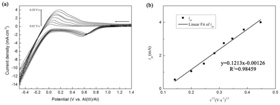 (a) A series of cyclic voltammograms recorded in DES-AlCl3 with different scan rate. Scan range: −0.5 to 1.4 V, (b) Relationship between the peak current () and the square root of scan rate.