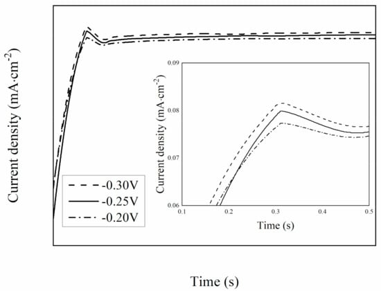 These curves initially show a rapid upward trend due to the formation and growth of the aluminum core on the electrode surface. The rising current eventually reaches its maximum () at time (), when the individual diffusion areas of the crystal begin to overlap [32]. Subsequently, the current curves decay as the deposited layer becomes thicker. With the applied potential being more negative, the time reached to is shortened (from inset of Figure 3).