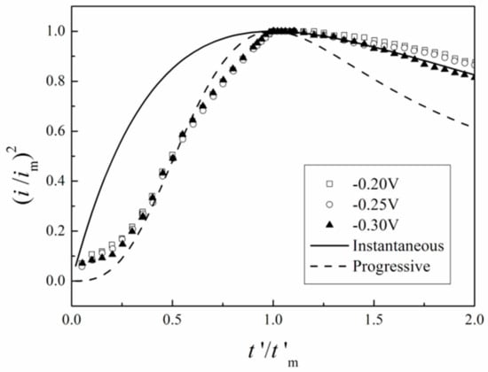 The hemispherical diffusion model, summarized by Allongue and Souteyrand, was the three-dimensional nucleation and growth process of metal ions. It is another type of Sharifker–Hills model, which was suitable for the process of diffusion-controlled nucleation and growth [32]. According to Figure 2, the restriction factor of electrodeposition is the diffusion of Al. So the hemispherical diffusion model was selected to explain the nucleation and growth process. This model has two limiting cases: instantaneous nucleation Equation (2) and progressive nucleation Equation (3) [33]. They are expressed respectively by