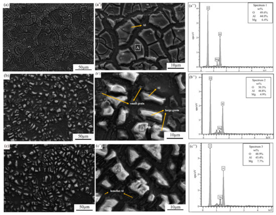 The distribution of deposits was obtained by scanning electron microscopy (SEM). Figure 5 shows the surface morphology of Al particles electrodeposited on AZ31 Mg alloys. As shown in Figure 5, the film and grain are formed on the substrate surface. Besides, the analysis of EDS revealed that the deposits were Al2O3, which may improve the corrosion resistance of magnesium alloy substrate. As Figure 5b’,c’, with the deposition time rises (from 1 h to 3 h), Al particles in different locations start diffusing stacked (Figure 5b’). Lamellar Al along the direction of diffusion was formed (Figure 5c’); as a result, there existed lamellar depleted Al zones around the big grain Al-rich region. It means that the deposition of Al on Mg alloys electrode abides by the following rules: the initial stage is progressive nucleation, and the later stage is instantaneous nucleation. It is consistent with the result of chronoamperometry (Figure 4).
