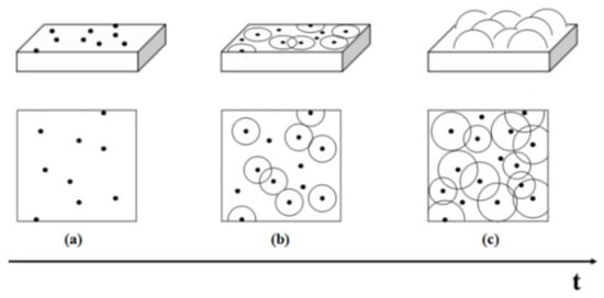 Figure 6 is a model diagram of nucleation and growth. First, the Al ions in the electrolytes are diffused from the solution to electrolytes and electrode interface. Based on previous calculations, the diffusion coefficient of Al ions is 1.773 × 10−10 cm2/s. Then, the Al ions reached the electrode at the active sites, nucleated on the surface of the electrode at the same time. The growth of nuclei includes two directions: planar growth and vertical growth. At the early growth stage, the planar growth is dominated (Figure 6a). Finally, the nucleus decreased with the increase in deposition time (Figure 6b,c). With the deposition decreased, the growth rate is slowing down gradually. So, Al ions are stacked up by hemispherical models, and the Al particles of the electrode surface are diffusing stacked at the same time. At the later stage of deposition, coating continues to grow. Meanwhile, the nucleation process does not exist. It is the reason for the grains size decreasing, as shown in Table 2. This nucleation and growth process is similar to the Al depositing on stainless steel [18], but the diffusion coefficient of Al/AZ31 (1.773 × 10−10 cm2/s) is lower than Al/stainless steel (1.20 × 10−8 cm2/s).