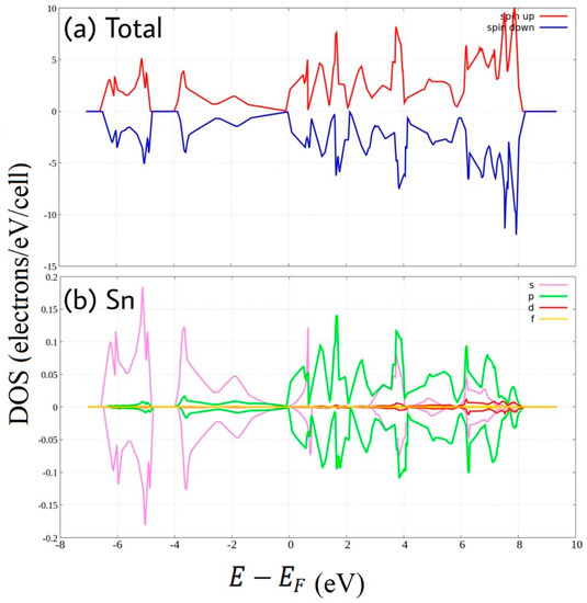 Spin-polarized Density of State of pure stanene. (a) total DOS (b) PDOS of Sn atom.
