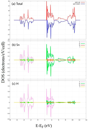 Hydrogenation clearly creates a wide gap around the Fermi energy of stanene (Figure 3). Above fermi energy, peak belongs to H 1s states and Sn 5p states overlap in the same energy region or change in the same way indicating hybridization. Also below fermi energy, H 1s states hybridize with Sn 5s states. This hybridization is attributed to the covalent bonding of Sn-H, as reported by previous first principle calculations [25]. Formation of energy gap due to hydrogenation has been reported previously in other 2D honeycomb materials such as graphene [26,27], germanene, and silicene [28]. It is also clearly seen that the up and down DOS have been “shifted” with respect to each other in the region from 2.5 eV to 5 eV which arise primarily from the Sn 5p states and H 1s states. This shift is responsible for the increase of the magnetic moment of stanene.