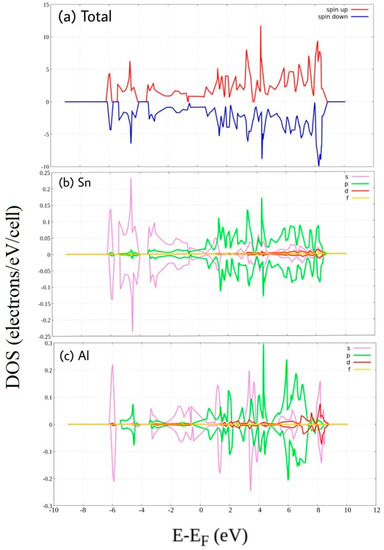 Spin-polarized Density of State of Al-doped stanene. (a) total DOS, and PDOS of (b) Sn atom and (c) P atom.