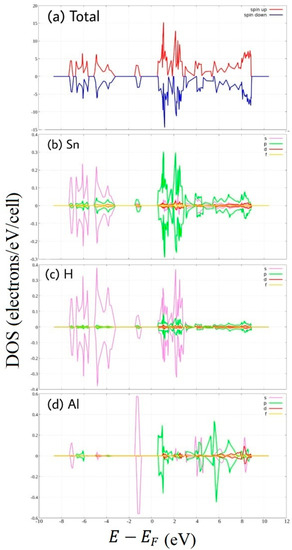 Spin-polarized Density of State of hydrogenated Al-doped stanene. (a) total DOS, and PDOS of (b) Sn, (c) H atom, and (d) Al atom.
