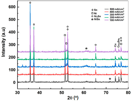 The resultant coatings were characterized for their phase evolution as shown in Figure 3. The various peaks were matched with the standard powder diffraction files—i.e., JCPDS File 04-0673 (for β-Sn), 01-1260 (for Ni), and 35-1362 (for Ni3Sn intermetallic compounds (IMCs))—that may have come from the adherent layers of the substrate. The Cu20Sn6 IMCs were formed in the coatings because Sn–Cu atoms diffused at the grain interfaces and precipitated out. All the samples showed a similar trend, which is consistent with a few research reports [31,32].