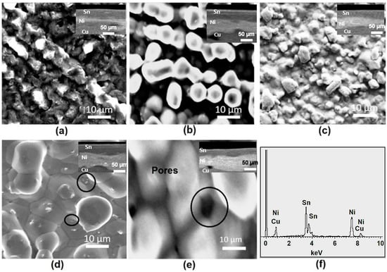 Such types of globular structures are believed to form due to the absorption effect of sodium saccharin or SDS (Sodium Dodecyl Sulfate) additives [34]. The development of pores is indicated by encircled areas in Figure 4d,e. The cross-section images in the insets also confirm a similar behavior. The EDS analysis of the coatings showed the presence of Sn, Ni, and Cu in the deposit (Figure 4f). The compositional analysis of the Sn-plated Ni/Cu coatings is shown in Table 3.