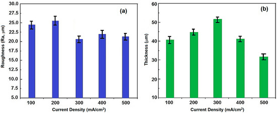 (a) Deposit roughness and (b) thickness of the coatings at various current densities.