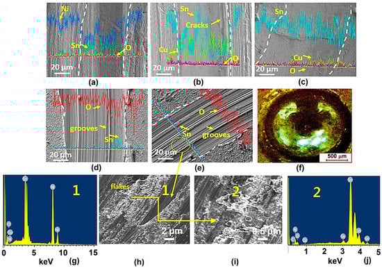 The worn-out surface morphology of the wear tracks after ball-on-disc wear is shown in Figure 7a–e. For wear track morphology, we selected the sample with the highest microhardness, plated at 300 mA/cm2. We can see that the width of the tracks was affected when the load was varied from 2 to 10 N. The line scan profile is also presented in the same SEM image for comparison. We found that at lower loading forces (2 N), the concentration of Ni and Sn was irregular across the track, being higher than Sn. It means the worn-out surface was non-uniform in Sn and Ni composition, with few scratches due to improper contact load. As the load increased to 4–6 N (Figure 7b,c), the wear surface turned slightly smooth and flat due to the proper sliding of the ball on the coating. The concentration of Sn improved gradually all over the surface, showing uniform wear (Figure 7c).
