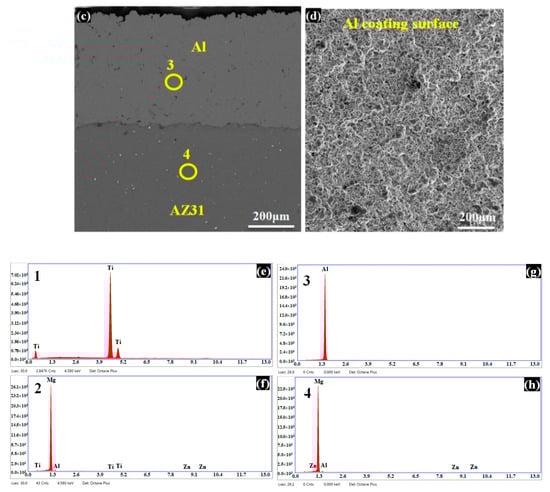 SEM images from (a) cross section of Ti-coated AZ31B, (b) Ti coating surface, (c) cross section of Al-coated AZ31B, (d) Al coating surface, EDS analysis of 1 (e), 2 (f), and EDS analysis of 3 (g), 4 (h).