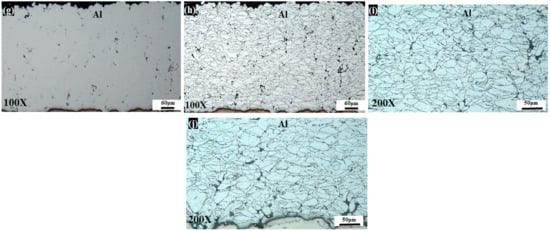 In this study, CP-Al coating with porosity level of about 1.00 ± 0.20% depicted higher porosity level than as-sprayed Ti coatings (Figure 3f–j). The presence of considerable number of micro-pores and even (worse) micro-cracks in cold sprayed CP-Al coating microstructure (at inter-particle boundaries) on AZ91D Mg alloy was also reported by Y. Tao, et al. []. In fact, lower degree of localized plastic deformation (localized heating, stresses) [] resulted in an extensive formation of micro-defects at inter-particle boundaries. Cold sprayed Al coating with high denseness and having sub-micron sized grains considerably improved the corrosion resistance compared to CP-Al bulk substrates [,].
