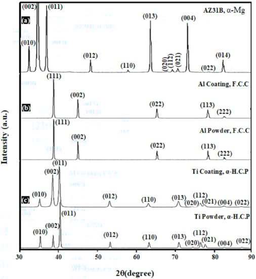 XRD patterns of (a) bare AZ31B, (b) as-received Al powder particles and as-sprayed Al coating, and (c) as-received Ti powder particles and as-sprayed Ti coating.