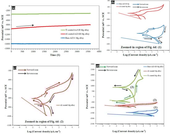 From the open circuit plots (Figure 6a) it can be seen that the surface of the samples was quite stable over the period of 1 h. The OCP values increase in the order: AZ31B < Al-coated AZ31B < Ti-coated AZ31B. It is evidently seen that bare Mg alloys with lower values of OCP are more susceptible to corrosion compared to coated Mg samples which showed higher values of OCP. But, Al-coated AZ31B is more active than Ti coated AZ31B.