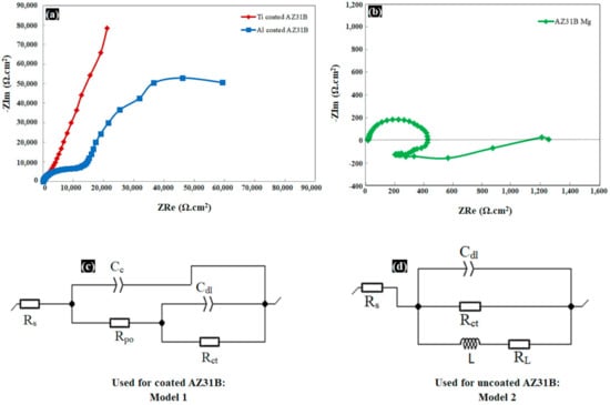 For further elucidation of the influence of cold sprayed coatings on the corrosion behavior of AZ31B Mg alloy, electrochemical impedance spectroscopy (EIS) of coated and uncoated Mg alloys was measured at their OCP. Nyquist plots are shown in Figure 7a,b. The impedance spectra was fitted by the electrical equivalent circuits (shown in Figure 7c,d: models 1 and 2). For the Nyquist diagram of uncoated sample (Figure 7d), one inductive loop and one capacitive loop at low frequency and high frequency were considered, respectively. This assumption is in harmony with the previous researches [,]. EEC (electrical equivalent circuit) for uncoated Mg alloy is comprised of Rct (charge transfer resistance), Rs (electrolyte resistance), Cdl (CPE related to electrical double layer), adsorption inductance (L) and adsorption resistance (RL) elements.
