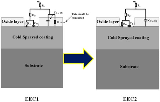 Impedance spectra of the coated samples were fitted by using the electrical equivalent circuit, as shown schematically in Figure 8. This schematically EEC includes Rs which is ohmic solution resistance at the working electrode/reference electrode interface; loop Rox-Cox which shows the resistance (Rc or Rox) and capacitance (Cc or Cox) of the oxide film; Rct and Cdl; Rpo that is the electrolyte resistance (as additional resistance) in the localized corrosion sites (and/or the pores). The Rc or Rox values are pretty high and any conduction of electrons through the oxide layer has been reported to be impossible [,]. Thus, Mansfeld and Kendig [] proposed the removal of this circuit element from EEC and replacement of EEC1 with EEC2 [,]. This simplified EEC2 has been also reported in the previous researches [,,,], so a capacitive loop at high frequency and another capacitive loop at low frequency regions were assumed for the coated Mg samples. Likewise, with regard to the non-ideality of the systems, the capacitors were replaced with the constant phase elements (CPE) for all samples [,].