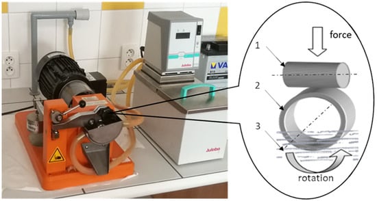 The Reichert test was used to evaluate the lubricity of the analyzed motor oil samples listed in Table 1. The essence of testing on a Reichert M2 (Petrotest, Inc. GmbH, Dahlewitz, Germany) is a simulation of a real frictional contact of a fixed stationary roller (1) pressed against a rotating grinding ring (2) partly immersed in the tested lubricant (3). Figure 1 shows the workplace of the Reichert test. The PETROTEST methodology was used to evaluate the load capacity of the oil film. The load-bearing capacity of the lubricating film (BCLF) is defined by Formula (1). The equation shows that the load-bearing capacity of the lubricating film is inversely related to the size of the elliptical wear surface (WS) on the fixed stationary roller. For this reason, only WS values, according to Formula (2), are presented in the paper.