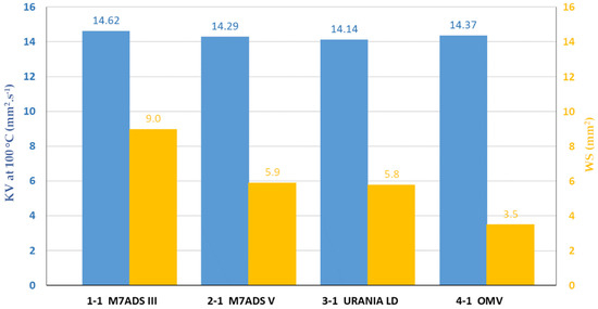 As follows from Formulas (1) and (2), the wear of machine parts is related to the load capacity of the lubricating film. Therefore, lubricity can be included among the most important parameters of lubricants, affecting the life of the tribological system [49]. The results of the Reichert test and the determination of KV at 100 °C testing of new motor oils are shown in Figure 2.