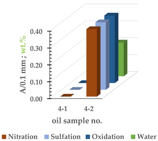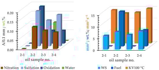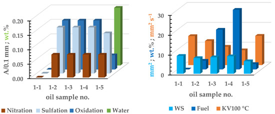 In the case of testing used motor oils M7ADS V 15W-40 sample no. 2-2, 2-3, 2-4 (see Figure 4 and Table 2) with the distance of 12,335 km, 25,888 km, and 25,900 km, the concentration of the additive ZDDP was recorded at the level of 74%, 67%, and 59%, i.e., the limit value of 30% was not exceeded. Based on the fuel identification in the motor oil, two samples were diagnosed with a fault in the injectors. These were samples no. 2-2 and 2-4, in which the fuel concentration reached 17% and 7% and KV changed by about −9%, +8% relative to the viscosity of the new oil. Oxidative degradation accompanied by sulfation and nitration could be observed in the sample of motor oil no. 2-2, which was in 1/3 of its exchange interval. Oxidation of oil (hydrocarbons) produces various oxidation products, such as aldehydes, ketones, acids, esters, and others. Thanks to nitration from the flue gas, organic nitrates are also formed in the oil, which are also accompanied by sulfation products. The authors believe that, in addition to sulfur oxides (SOx) from exhaust gases, a gradual decrease in ZDDP contributes to the formation of these substances. When testing this group of motor oil samples, the maximum wear of +34% with respect to the fresh oil was confirmed in borehole no. 2-4.