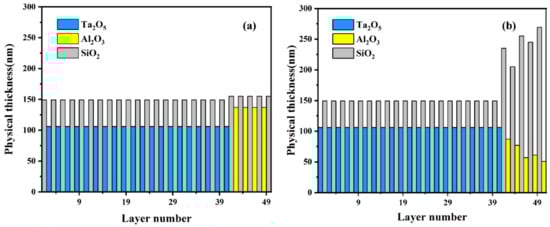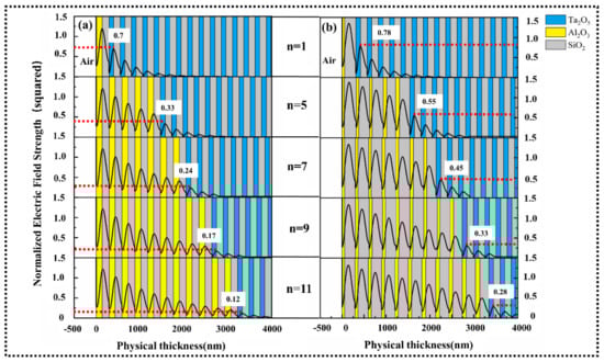 The design E-CLDM, based on the initial design, is optimized such that the electric field is shifted away from the material interfaces and into the low-index high-damage threshold material (SiO2). The electric field distribution of E-CLDM for different n is shown in Figure 1b. We keep the electric field in Al2O3 and SiO2 constant for different n. As the number of Al2O3 periods increases, the electric field in the Ta2O5 decreases. However, compared with the electric field in CLDM, the electric field in Ta2O5 of E-CLDM is higher. The layer profile of E-CLDM (n = 5) is shown in Figure 3b. It is obvious that the thickness of the Al2O3 is decreased, while that of the low-index material is increased [21]. The electric field distribution is shown in Figure 1b (n = 5), where the electric field intensity peaks are located in the low-index material and the maximum field intensities in Al2O3, SiO2 and Ta2O5 are 0.8 and 0.55, respectively. At the same time, the maximum electric field intensity in SiO2 increases to 1.35.