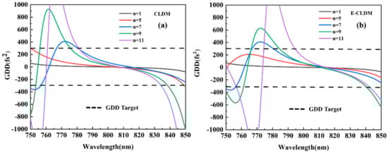 Dispersion for different numbers of protective layer periods. (a) CLDM, when n = 5, the maximum group delay dispersion (GDD) ripple is just under ±300 fs2. When n > 5, the GDD ripple does not meet the requirements; (b) E-CLDM, when n = 5, the modified design has a superior dispersion value of ±175 fs2, compared to the value of ±300 fs2 for the CLDM stack. However, for n > 5, the GDD ripple does not meet the requirements.