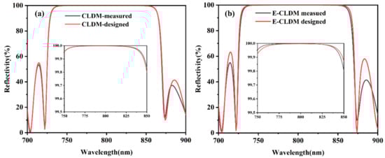 Measured and designed reflectivity of CLDM (a) and modified-electric-field CLDM (E-CLDM) (b) for p-polarization of 45° AOI.