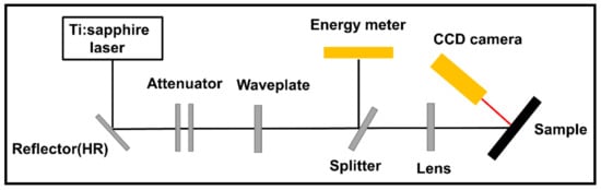 A laser damage test for two types of samples was performed in the 1-on-1 mode [22]. Pulses were generated by a Ti:sapphire laser system with an 800 nm central wavelength and a pulse duration of 30 fs, and were p-polarized and incident at 45°. The spectral range is 800 (±35 nm). The measurement spot area is 0.221 mm2 and the error range is 3%. The experimental setup is shown in Figure 5. A CCD camera was used to observe the damage in real time.