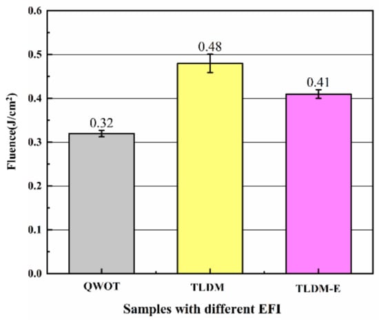Damage threshold results for quarter-wave optical thickness (QWOT), CLDM, and E-CLDM. The thresholds of QWOT, CLDM and E-CLDM are 0.32, 0.48 and 0.41 J/cm2, respectively. EFI—electric field intensity; Fluence—radiant energy per unit area.