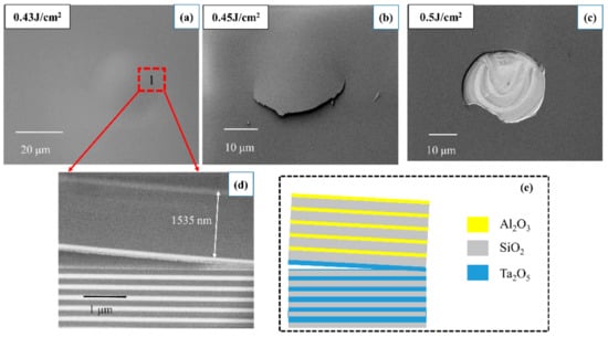 (a–c) surface damage morphology of E-CLDM at different fluences; (d) cross-sectional morphology of region 1 of the protrusion shown in (a); (e) diagrammatic sketch of (d). At a laser fluence of 0.43 J/cm2, an inner layer material was melted and gasified, and the resulting gas pressure deformed the outer layer, forming a protrusion. At a fluence of 0.45 J/cm2, the internal pressure exceeded the limit stress of the layer, and thus, damaged the protrusion structure. As the fluence was further increased to 0.5 J/cm2, the bulge structure was detached and exposed to a damage pit. The real thickness of Al2O3/SiO2 stack is consistent with the design thickness. The initial damage layer is located in the Ta2O5 layer.